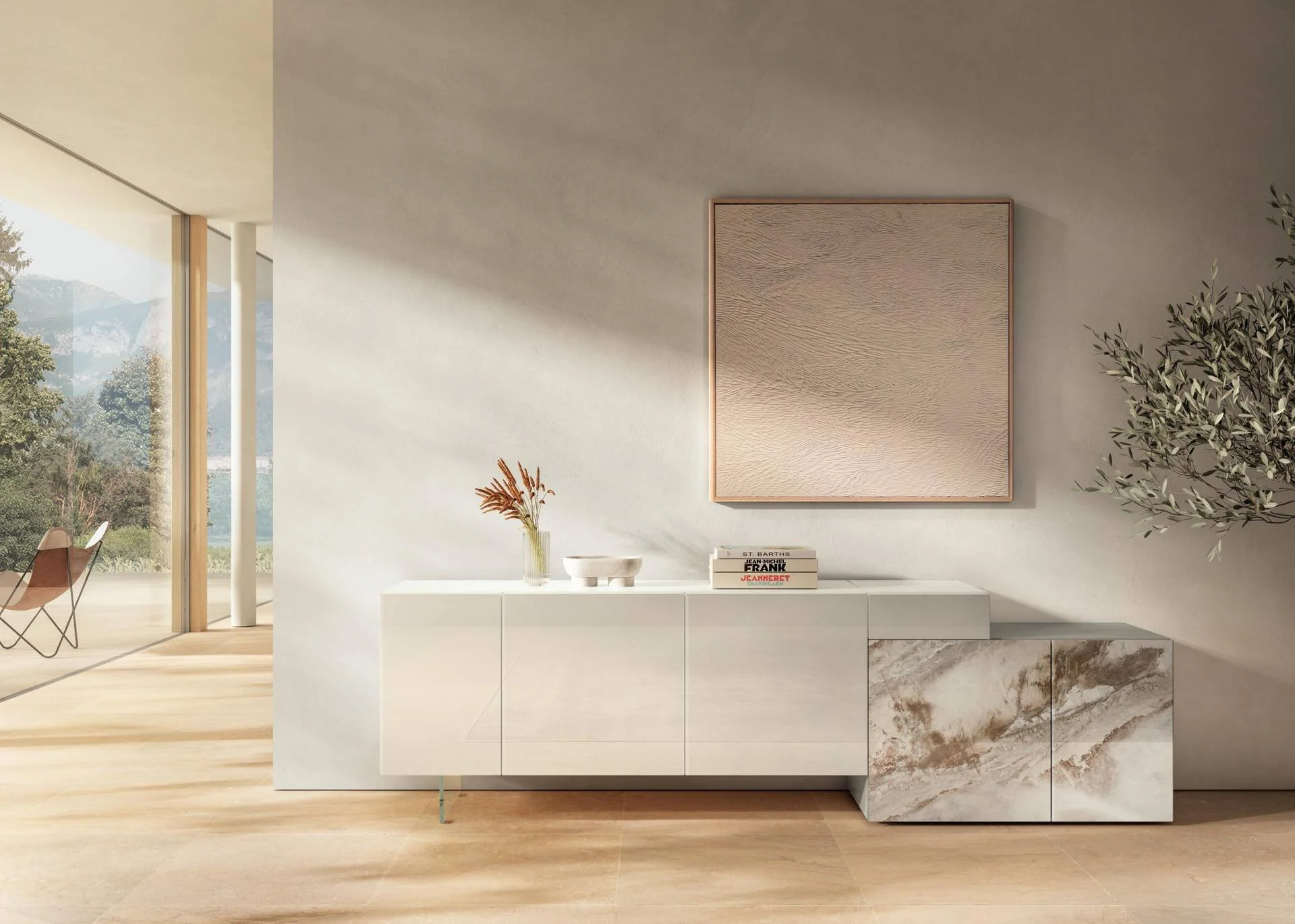 From the modular 36e8 range come these originally designed sideboards you can build to size, personalising the shapes and colours to provide storage space in any context and to suit any interior design style. Whether monolithic or deconstructed in their build, mounted on the wall or stacked on another unit, 36e8 sideboards can feature all-glass storage units plus LAGO’s “wall panels” to create even more design ideas. Their extremely durable design boasts an outstanding build including: original aluminium filigree and a 45° edge, a profiled door and interior lacquering, as well as materials such as Wildwood and coloured glass or the XGlass marble, metal, wood and fabric finishes.