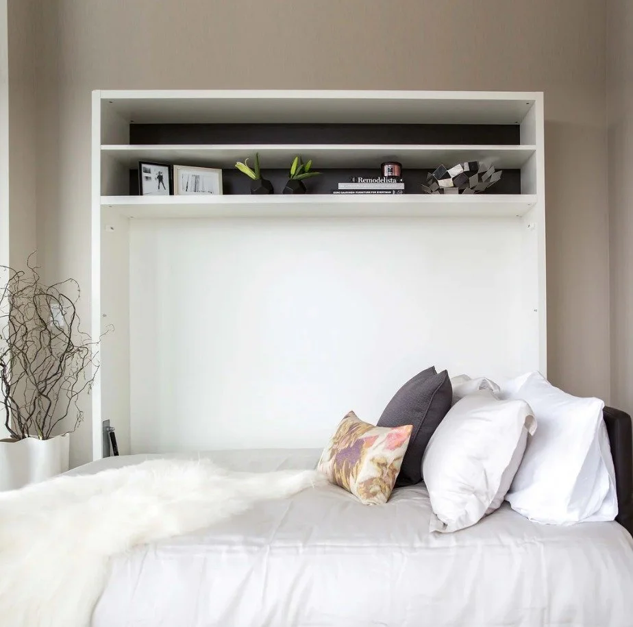 Adam Tavolo is a queen-sized wall bed with a five-foot, fold-down desk and an optional folding, padded headboard. Adam Tavolo opens horizontally to reveal a premium Italian queen mattress. The two shelves above the bed can be omitted to accommodate lower ceiling heights, making it an ideal choice for basements, attics, or rooms with soffits. Adam Tavolo is designed and made in Italy with the highest quality, sustainably sourced materials. Available in a wide selection of fabrics and finishes, including COM. This space-creating wall bed system is backed by a Lifetime Warranty on all hardware and mechanisms. Our stock Adam Tavolo includes a premium mattress.