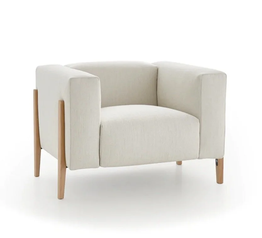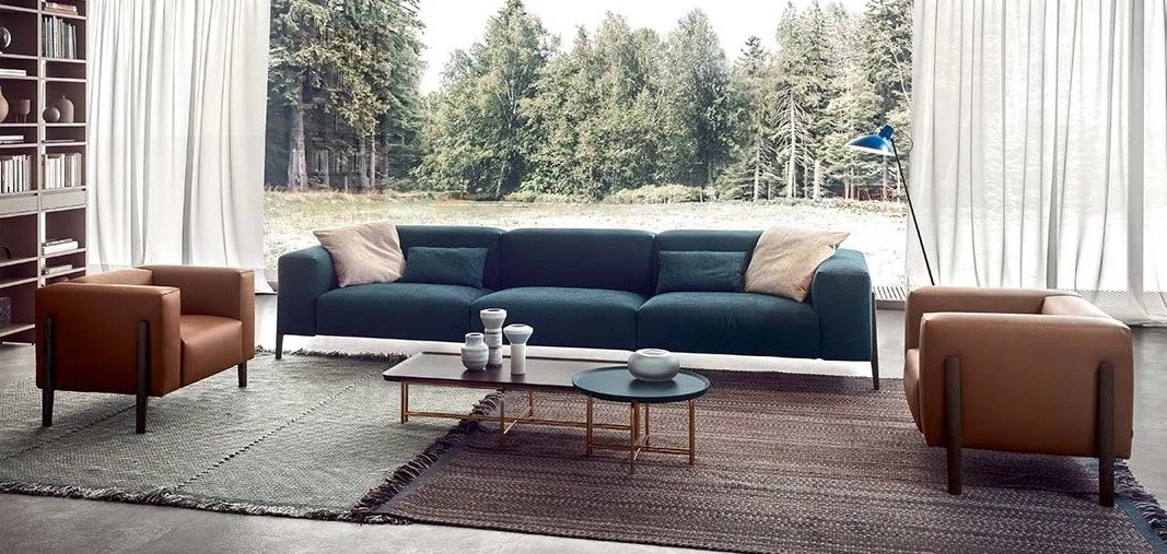 A challenge to gravity. All-in is all about bold design choices. Generous shapes and square volumes dialogue with a compositional essentiality rich in lightness and composure. To support a suspension of 18 cm from the ground there are high legs. They run along the sides with finishes chosen from those of the collection. Hidden from view, the structure is entirely contained in the cushions. The backrest is available in two versions, flush with the armrests or higher, solutions that can be combined with each other in mixed compositions.