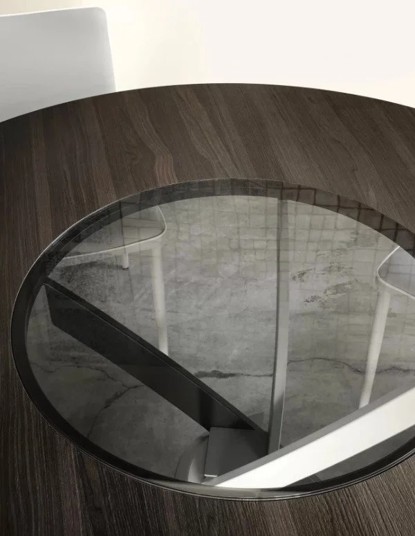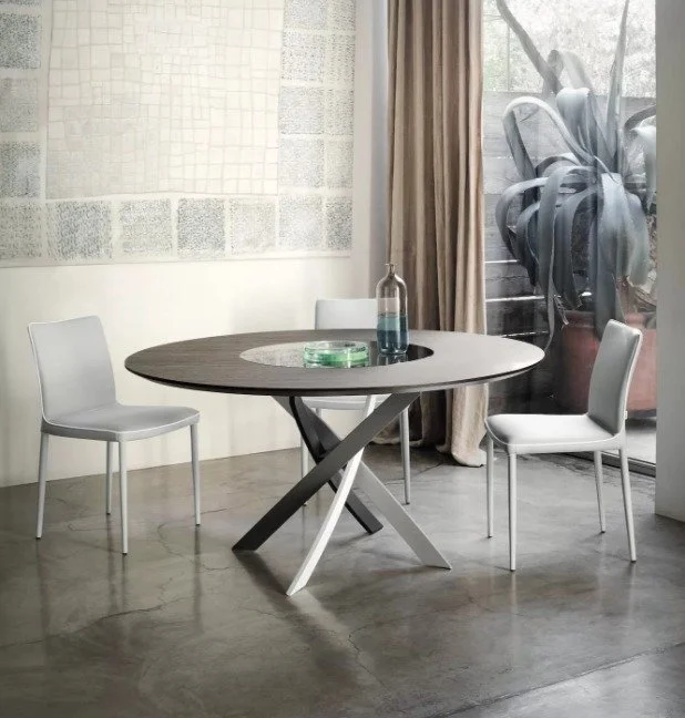 Round or elliptical table in fixed or extending version, with lacquered Metal frame. Top in Veneer wood, Glossy glass, Velvet matt anti-scratch lacquered glass or SuperMarble and fixed round table with central turntable in Glass, Glass anti-scratch or SuperMarble, ring top in Veneer wood.