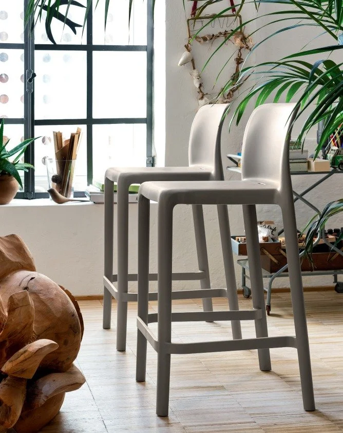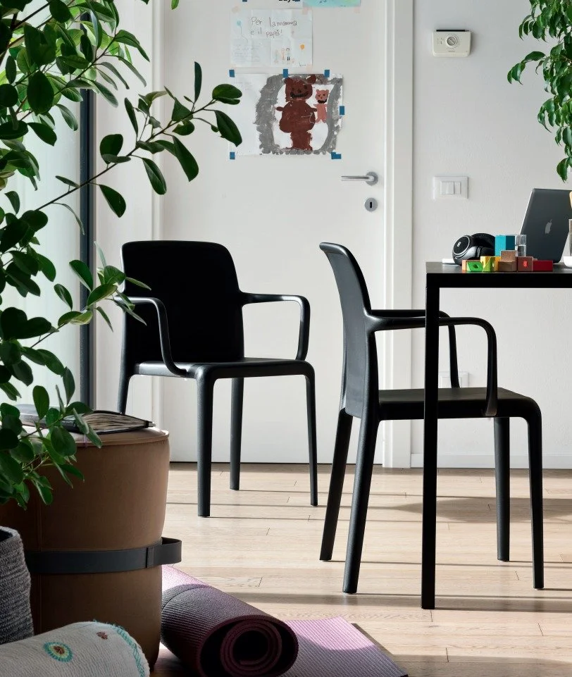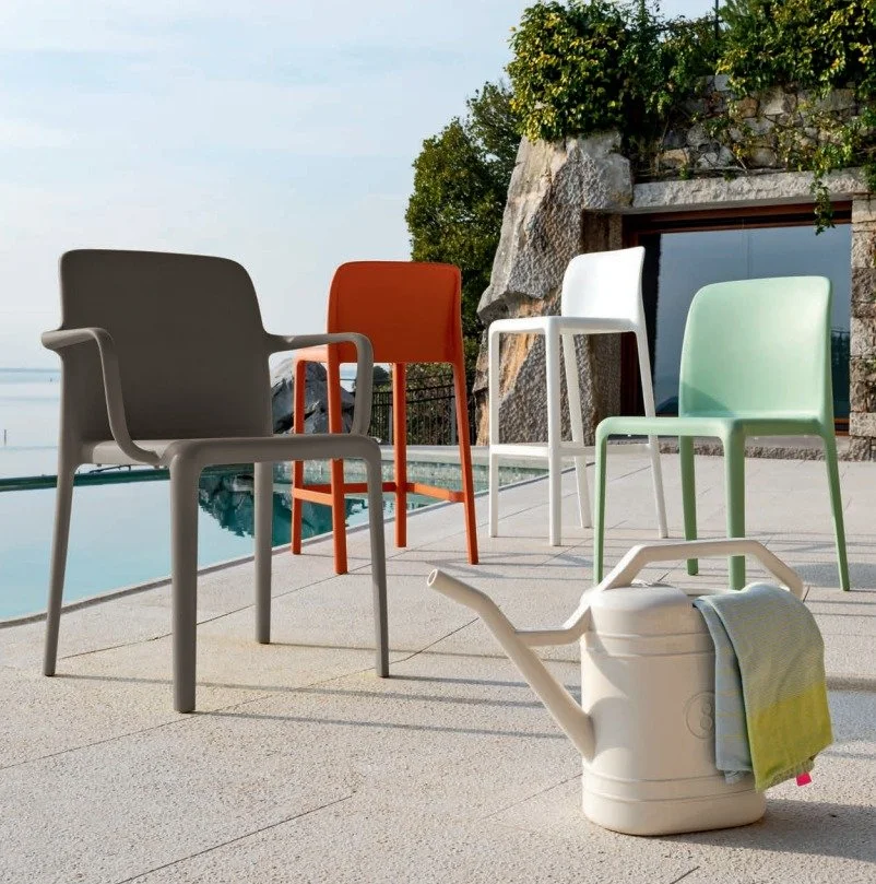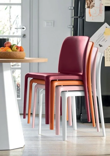 Its bold silhouette and rounded edges create an attractive contrast and bring to the fore the beauty of the gently tapering backrest. Suitable for home settings and contract-sector use. Perfect for outdoors as well, Bayo chairs are stackable up to 6 high. Interchangeable feet.