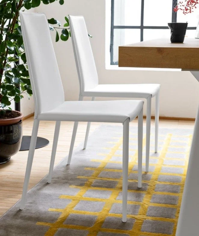 Seat and backrest are covered in regenerated leather - a material made from leather and other natural fibres, and finished like leather – while the conical legs are made from tubular steel. The design attention given to the legs can be seen also in the matching colours of the frame and contoured seat. The exposed seams further enhance the seat.