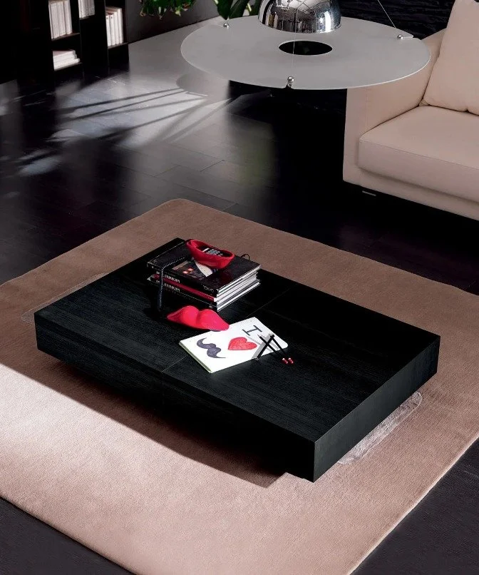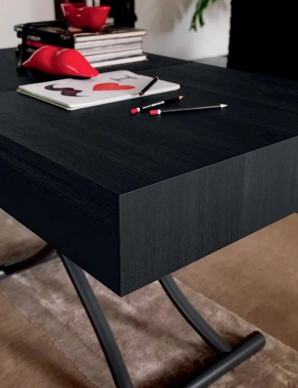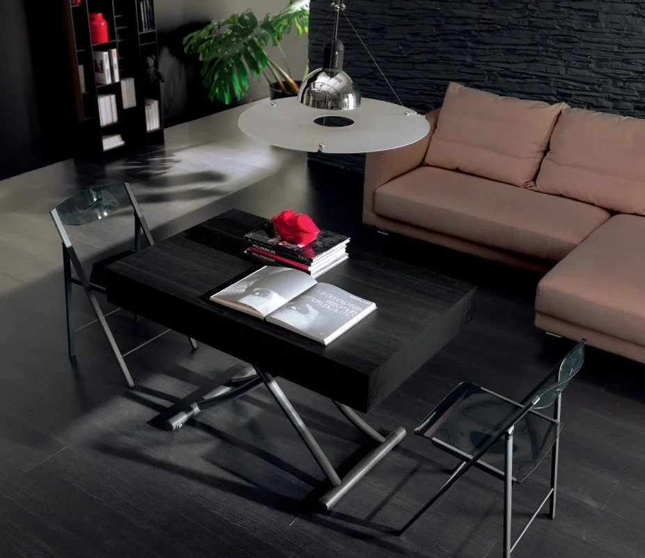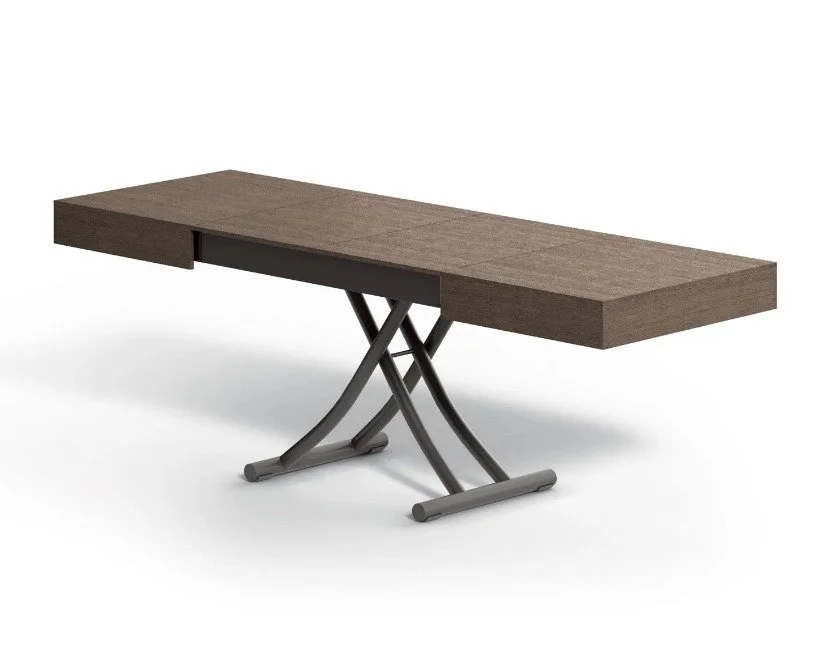 Transformable couch table; it turns into a dining table. Metal base, gas lifting device. Adjustable at any height, hidden wheels, inside extensions. Synchronised telescopic extension mechanism.