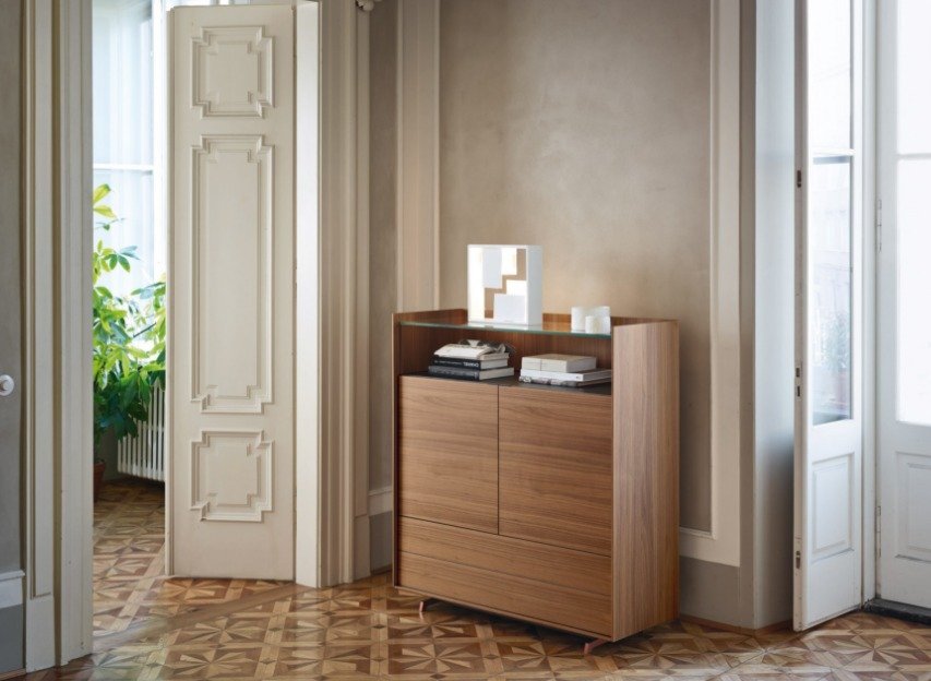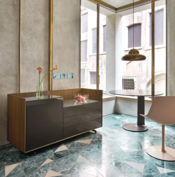 Finished on all sides, the CABARET sideboard can also be positioned in the center of the room, or placed behind a sofa. Cabaret can be made even more prestigious by the stoneware top with a Calacatta finish that forms a kind of tray. Another possibility is with the use of sandstone with Nero Africa marble effect on the front panels to make for a stand-out piece in the home, with a rare power of expression. Shaped feet in painted metal.