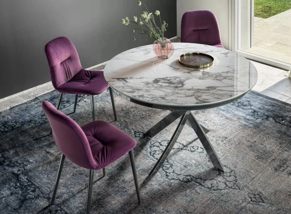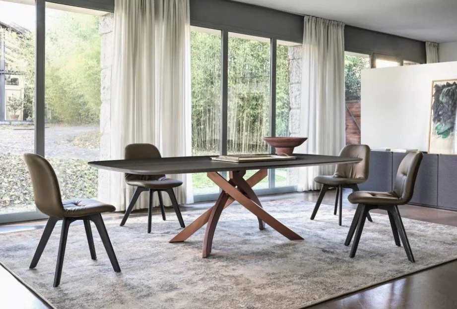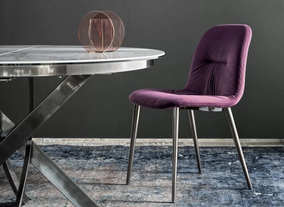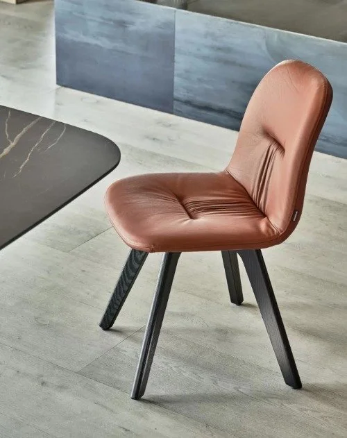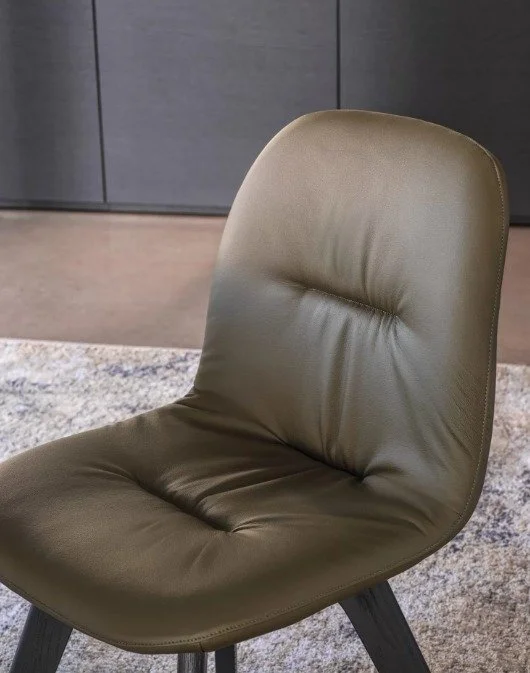 Chair with Solid wood frame and round rod metal frame, conical section metal frame, swivel chair with and without wheels lacquered frame. Upholstered and covered shell in Eco leather, Premium Eco leather, Technical velvet, Mambo and Lulù fabric, Waterproof Nabuk, Pure Virgin Wool, Velvet, Decò fabric, Kvadrat Field fabric, Coda Fabric and Premium Leather.