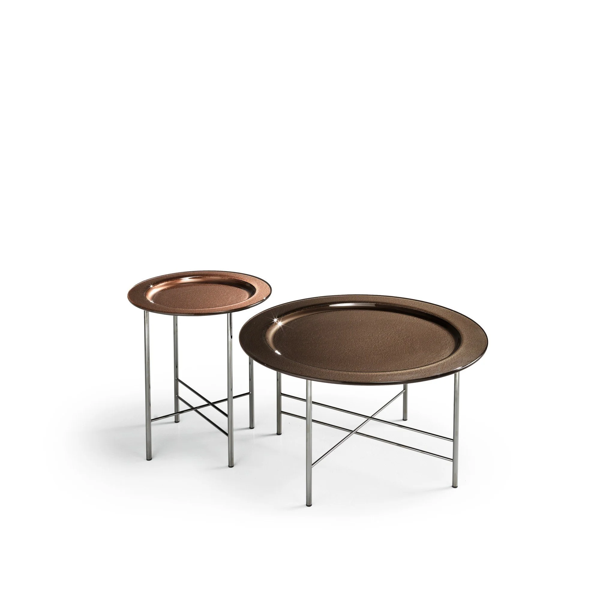 Round coffee table with top in 10 mm fused glass, back-lacquered with metallic paints. Metal base, Black Glossy Nickel finish.