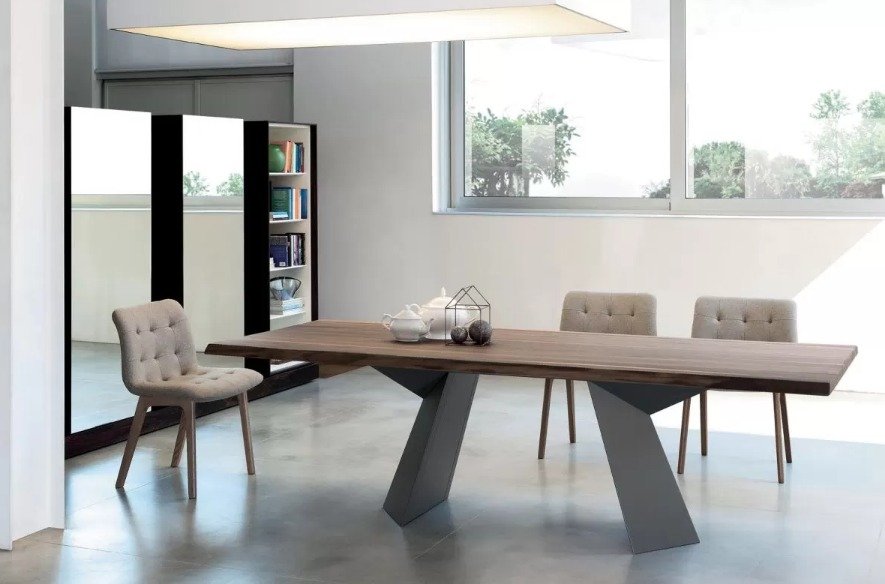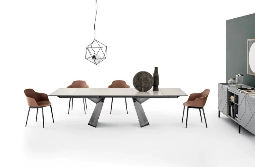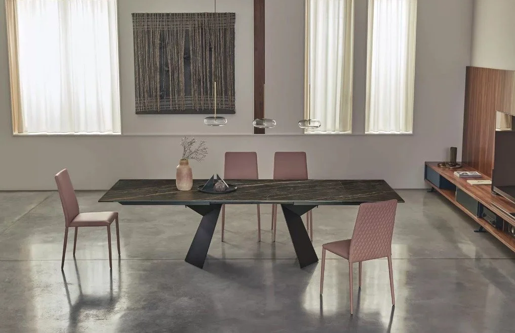 Table fix or with extensions, with lacquered Metal frame. Top in Solid wood, heritage walnut Solid wood, Veneer wood, Veneer wood with solid edge, Glossy glass, Velvet matt anti-scratch lacquered glass, SuperCeramic, SuperMarble and natural Marble.