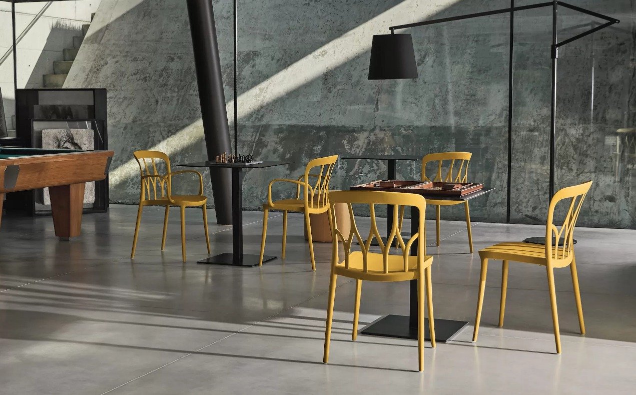 Galaxy is aesthetics, strength and functionality. The graphic decoration of the back gives the seat a lively and stylish soul. Galaxy offers comfort and lightness, it is stackable and ideal for outdoor purpose, too.