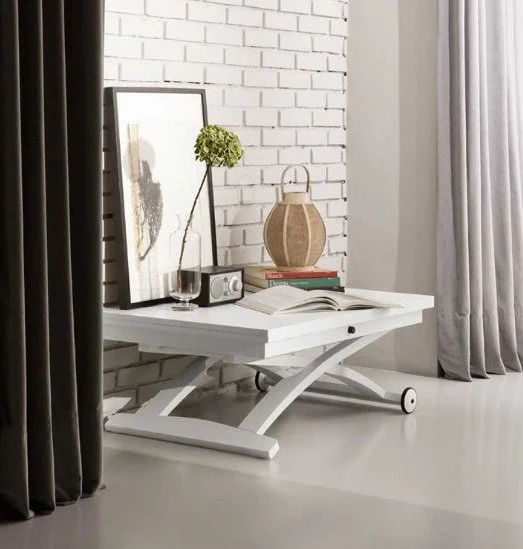 MASCOTTE is a versatile coffee table for your living area which, if necessary, and with just a few movements, turns into a dining table for 6 guests: just press a button, placed on the long side, to adjust the height to 7 different positions.