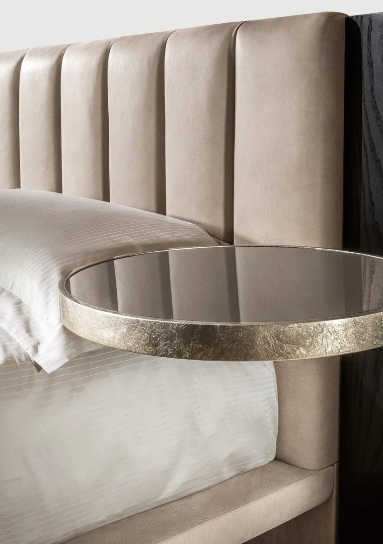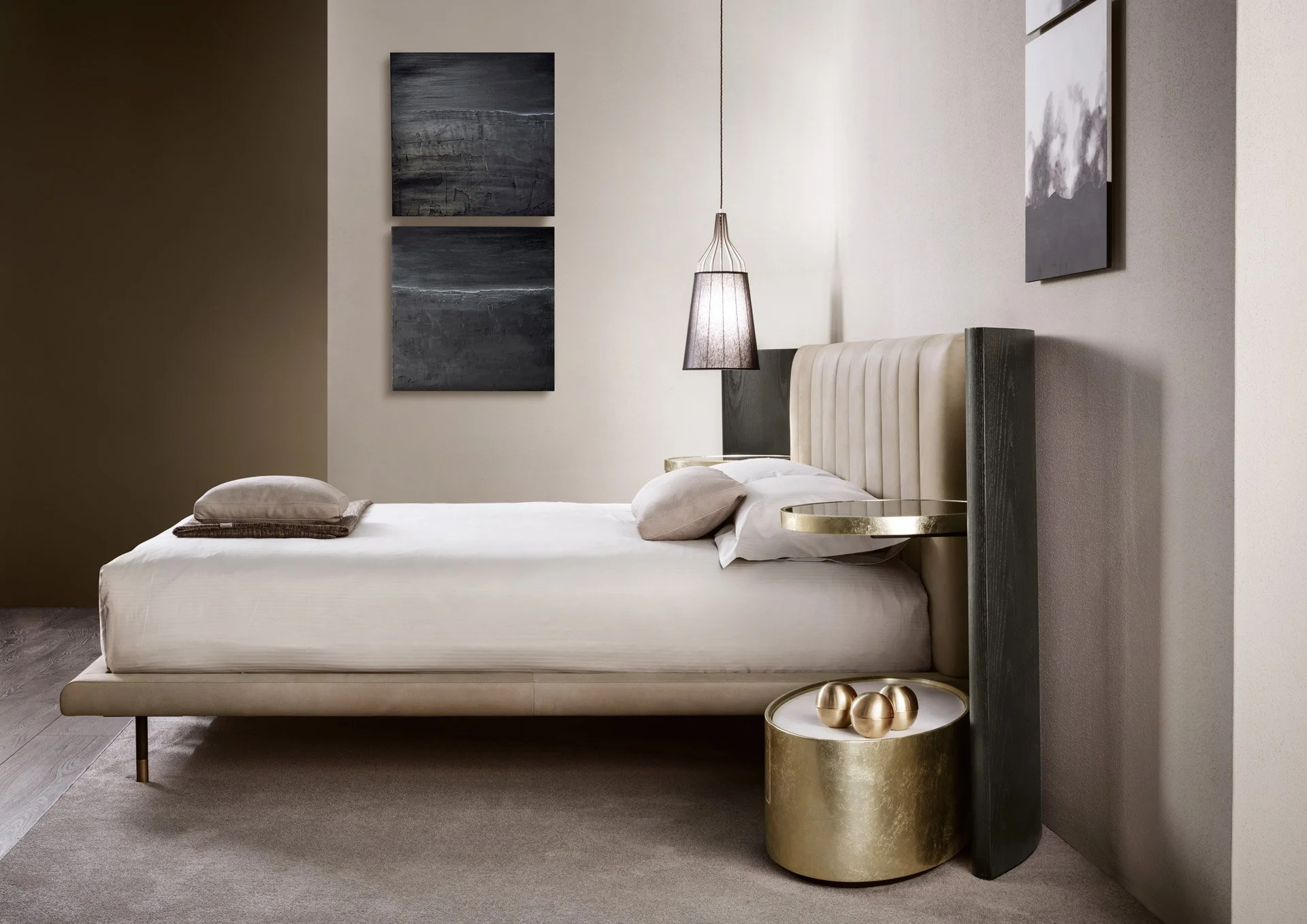 Mirage, a cosy integrated double bed system that amplifies the sense of comfort. Its internal structure is made of multilayer wood and solid poplar and beech; the structural covering is made of non-deformable polyurethane foam and a synthetic layer. The wide headboard, made of veneered wood, envelops the whole structure in an ideal embrace. The headboard and bed frame upholstery can be customized with fabric, leather, or eco-leather. The insertion of the two support surfaces is particularly notable: thanks to their rotation, they allow an easy use.