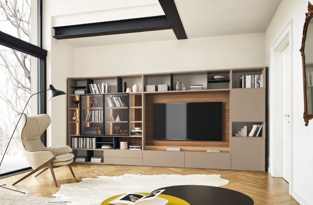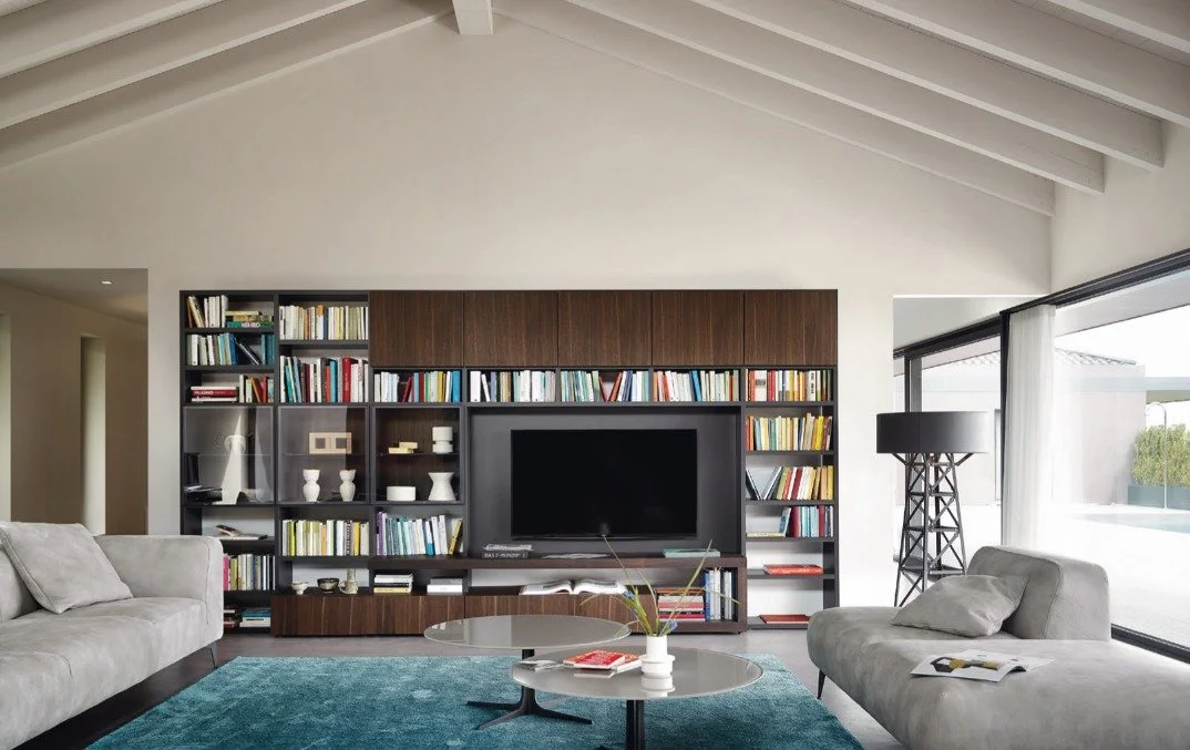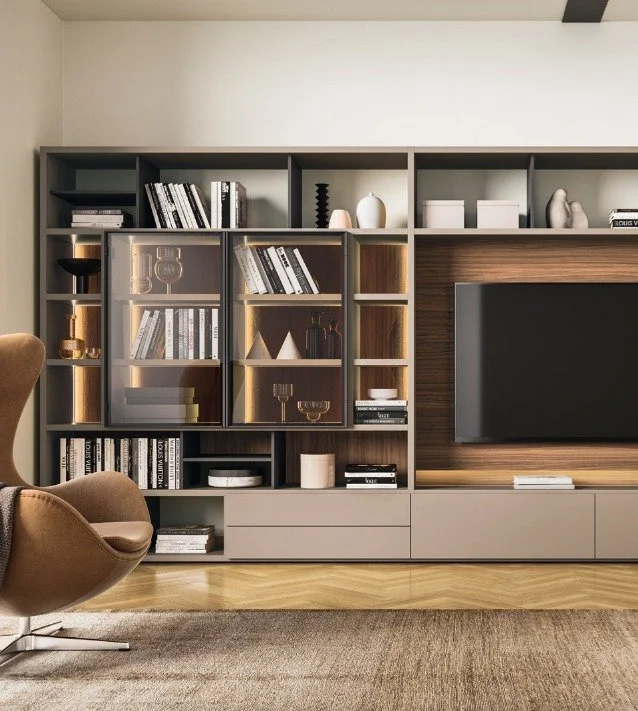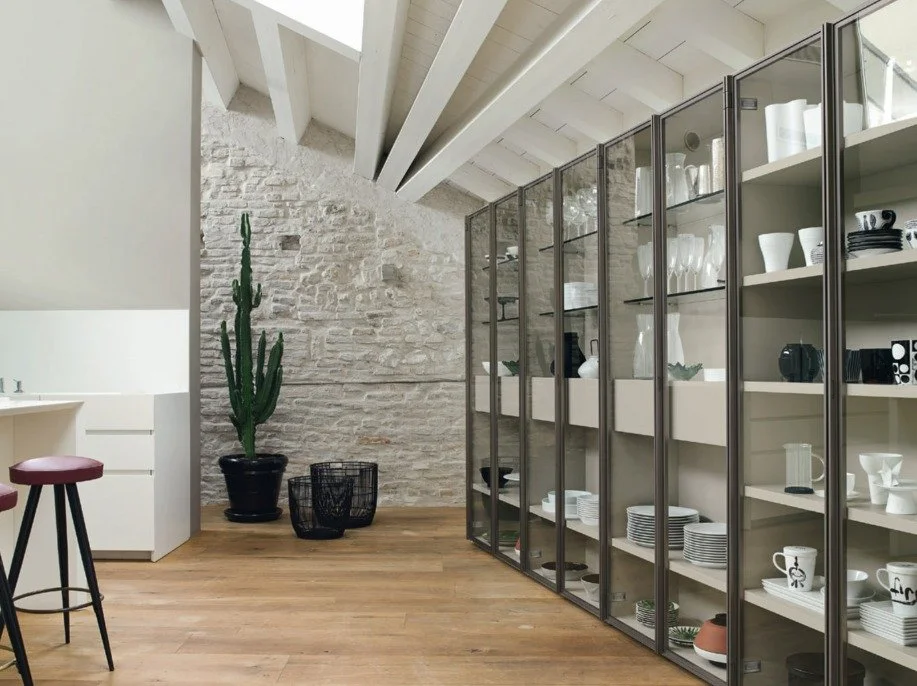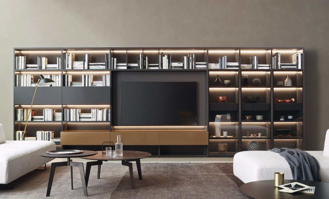 Its flexibility allows the move from a pure and perfect symmetry, with a sense of reassuring solidity, to an exciting lack of symmetry, with a dynamic effect created by internal partitions of different depths and thickness, positioned freely between the shelves, to facilitate the positioning of every type of object and storage unit.