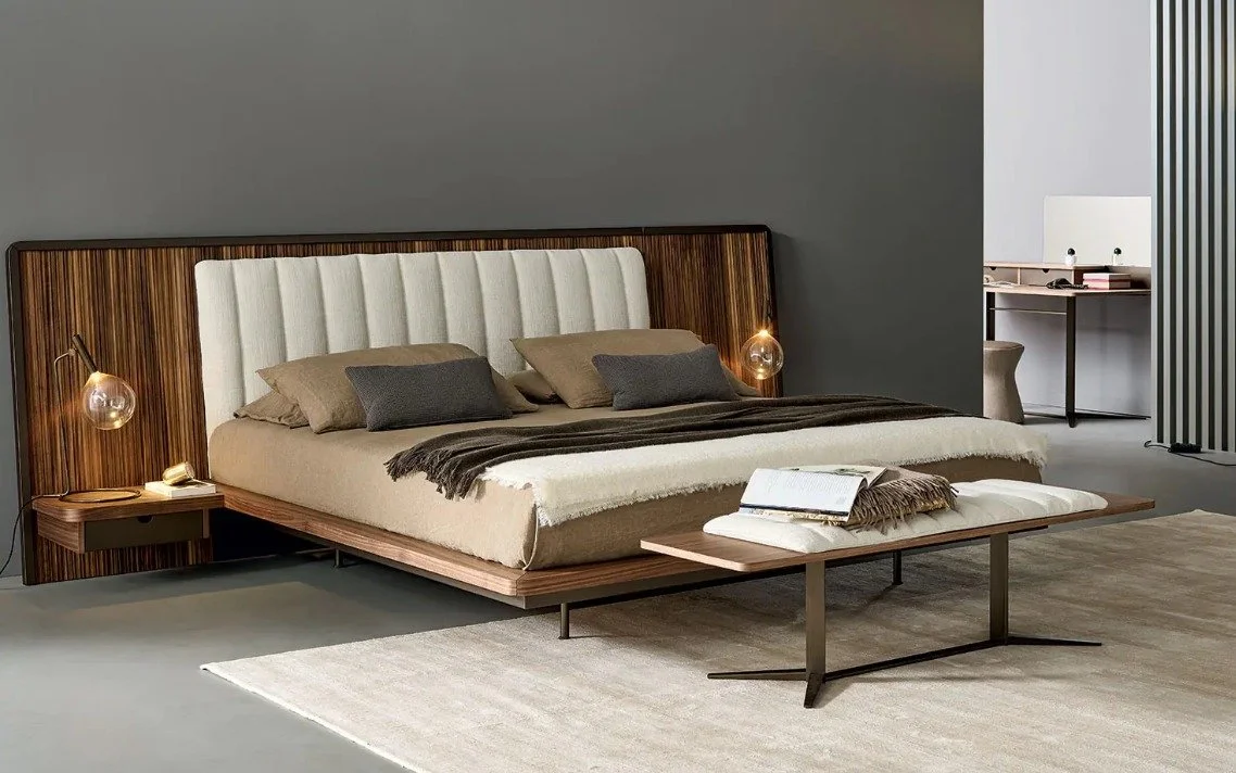 The Nelson bench blends seamlessly into a contemporary bedroom due to its sophistication and comfort. The plush cushion, upholstered in soft-to-the-touch fabric, is accentuated by intricate vertical detailing for a textured look. Contrasting it elegantly is the wooden seat underneath, which provides ample support while you relax. A sturdy metal base holds it up with two extending feet on both sides. It fits well at the foot of a bed for extra style and extra seating.