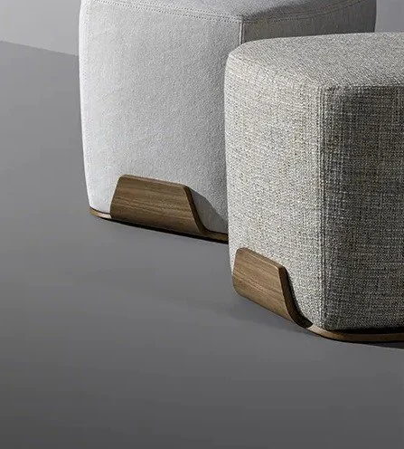 Soft and discreet, the pouf from the Olos collection is an element that completes the furniture found in the sleeping area but which is also perfectly at home in other areas of the house. The Olos pouf stands out both on account of its generous and rounded padding, and also because it is slightly raised off the ground thanks to the curved wooden base, a typical feature of the Olos collection.