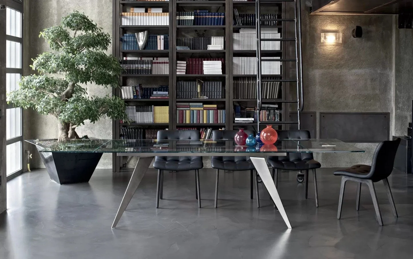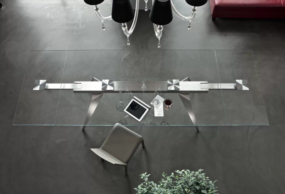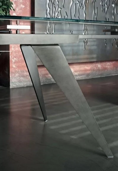 Table fix or with extensions and Metal frame.Top in Solid wood, Veneer wood, Veneer wood with solid edge, natural Marble, Glossy glass, Velvet matt anti-scratch lacquered glass and SuperMarble.