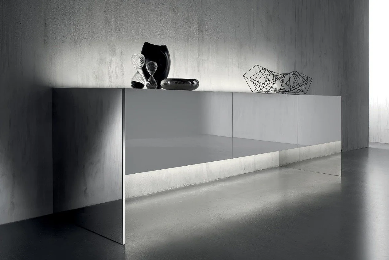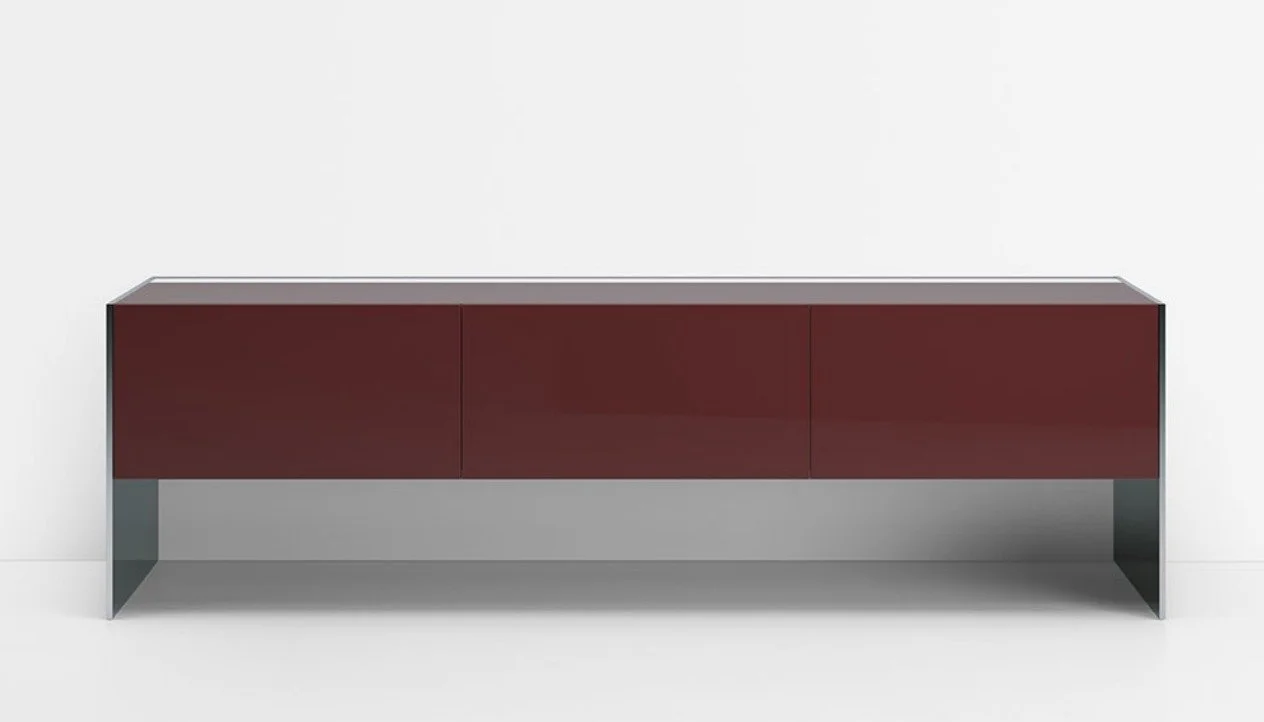 In a unique collaboration, award-winning designer Gabriele Buratti and Acerbis’ own Lodovico Acerbis created this unusually wide sideboard, emphasized by a minimalist structure that rests on two ephemerally thin side panels in mirror-polished steel, and bathed in light diffused by a matte methacrylate strip set into the top, with an illuminated interior and base as well.
