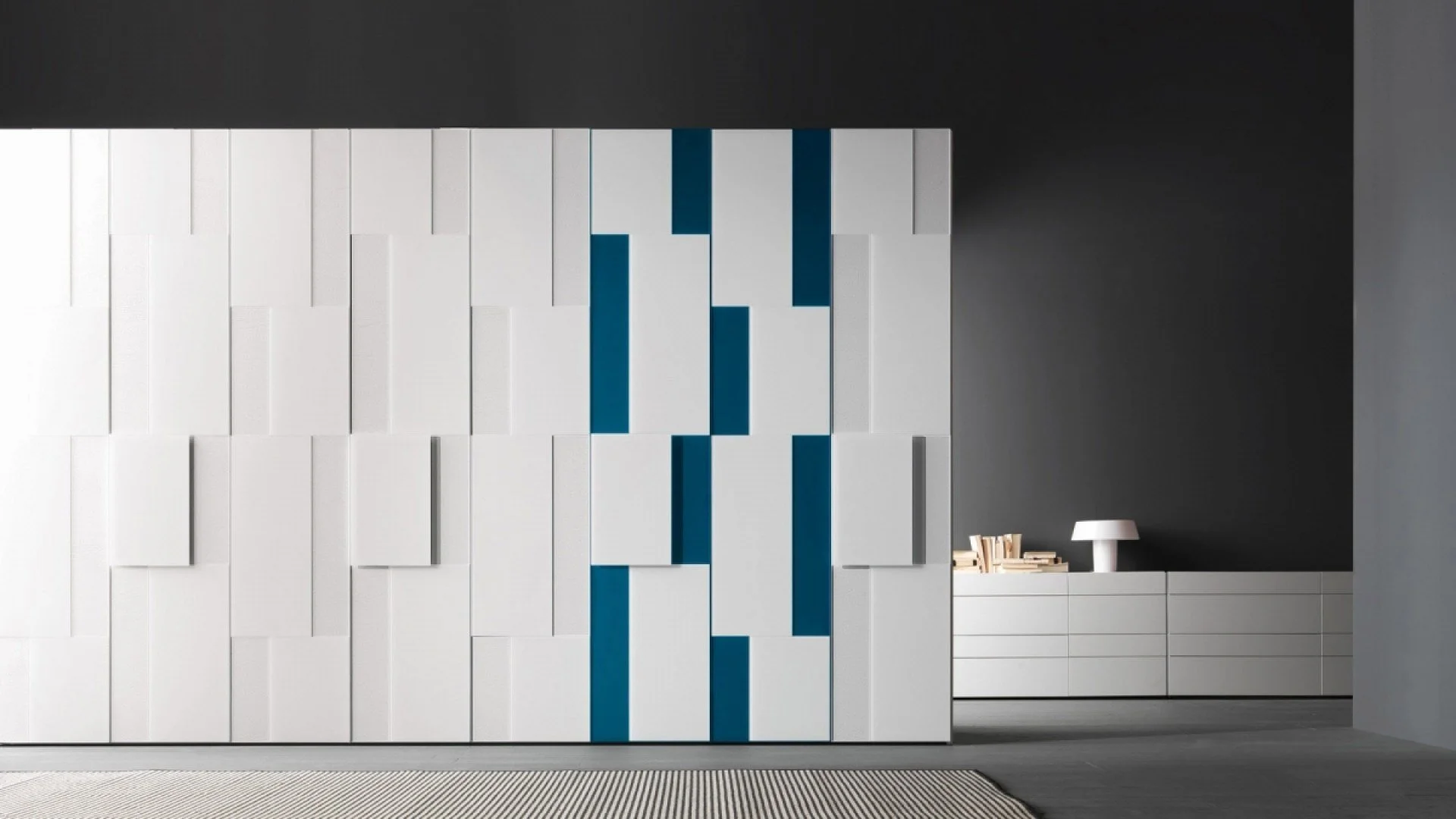 A Tecnópolis wardrobe with the Step door which, by combining full and empty, concave and convex spaces, creates a dynamic succession of volumes. The handle is derived from one of the door panels that protrudes slightly to make it easy to grasp.