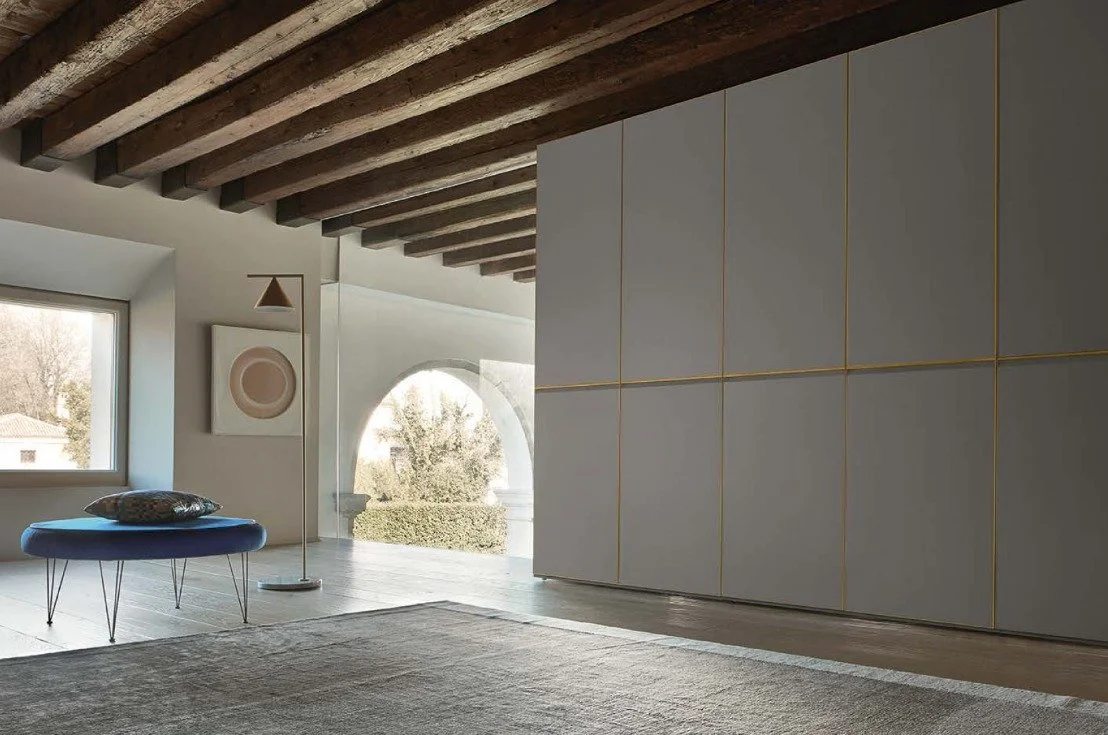 Key feature in the room, the Tecno wardrobe with matte Anthracite finish and grip handles in Brass finish blends seamlessly also into a period architectural space, adding a touch of contemporary minimalism.