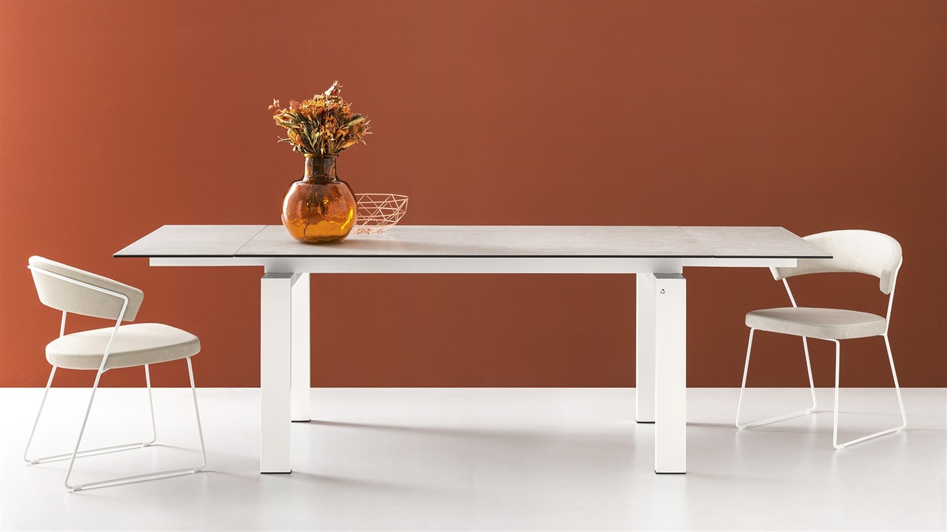 Zeffiro is an extendable table with a glass or ceramic top. Available with a metal frame, the table can be extended thanks to two independent side extensions that slide along aluminium guides that match the colour of the legs.